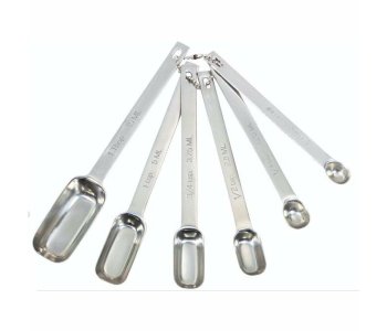 This beautiful set of six polished stainless steel long handled measuring spoons with clearly marked ml and teaspoon / tablespoon markings are all helpfully held together on a metal storage ring, reducing clutter in your kitchen