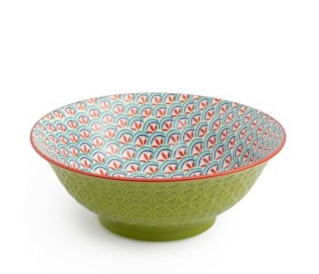 Bring style and colour to every meal with the Mikasa Green and Blue Geometric Stoneware Ramen Bowl