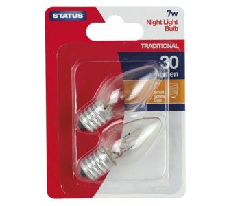 Pack of 2 nightlight replacement bulbs Wattage: 7W End Cap: E12 / Small Screw Cap Colour: warm white Lumens: 30 Carded Product Code: 7SNLE12CB212